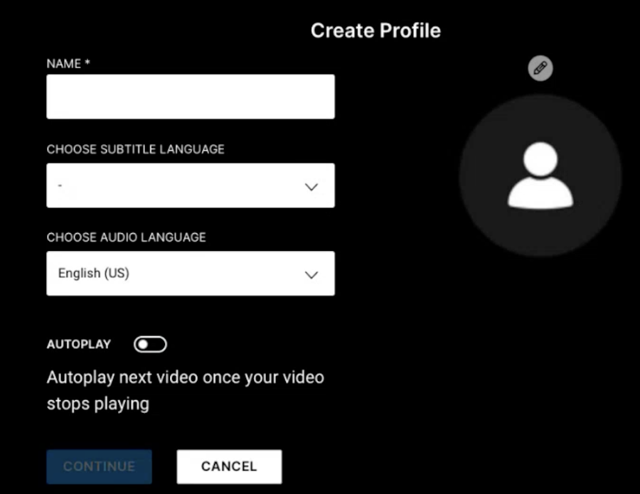 On this screen, you can create a new profile, create a username for the profile, change your avatar icon, select a subtitle language, and audio, and set autoplay settings.