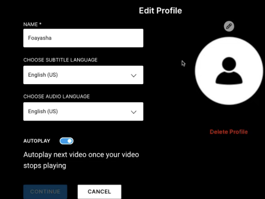 Now you can edit your profile, create a new profile, change or create a username for the profile, change your avatar icon, select a subtitle language, and audio, and set autoplay settings.
